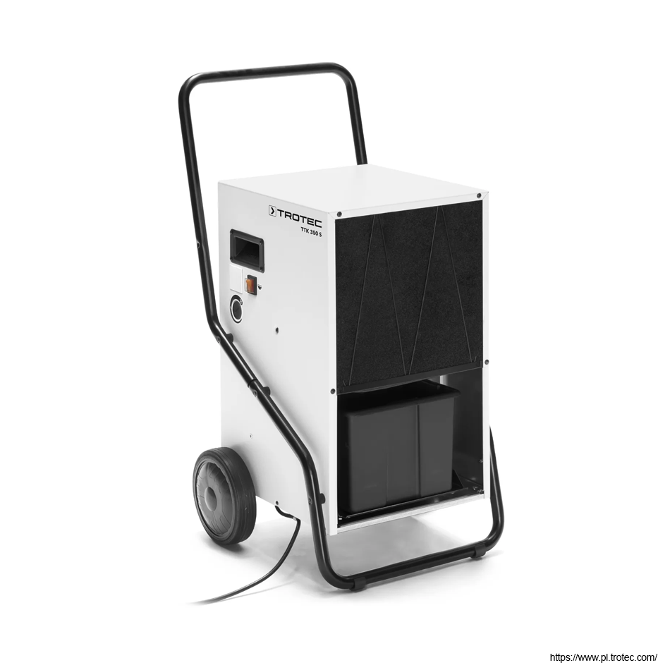 Osuszacz Trotec TTK 350 S skutecznie osusza pomieszczenia do ok. 180 m², osiągając wydajność do 63.5 l/24 h. Regulacja wilgotności odbywa się za pomocą pokrętła (zakres 32–100% RH), a wbudowany higrostat pozwala na w pełni automatyczną pracę. Urządzenie zapewnia też silny obieg powietrza – 490 m³/h.